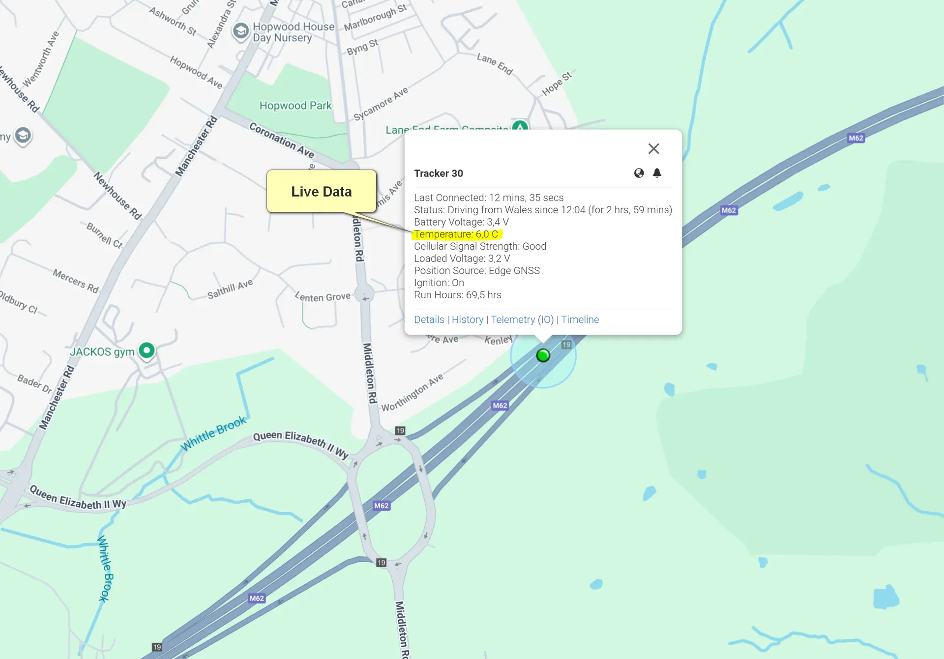 Miggy leverde de Digital Matter Barra Edge, een batterijgevoede GPS-tracker met ingebouwde temperatuursensor. De data worden elke 15 minuten doorgestuurd naar het Telematics Guru-portaal, waar Noordzee Koeriers alle ritten live kan volgen.